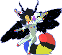 illusion is a ferret/fennec fox with primary colord and greys. he has giant crow wings and big gazelle horns. his claws are purle and green along with his eyes