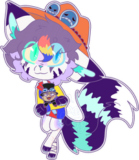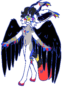 illusion is a ferret/fennec fox with primary colord and greys. he has giant crow wings and big gazelle horns. his claws are purle and green along with his eyes